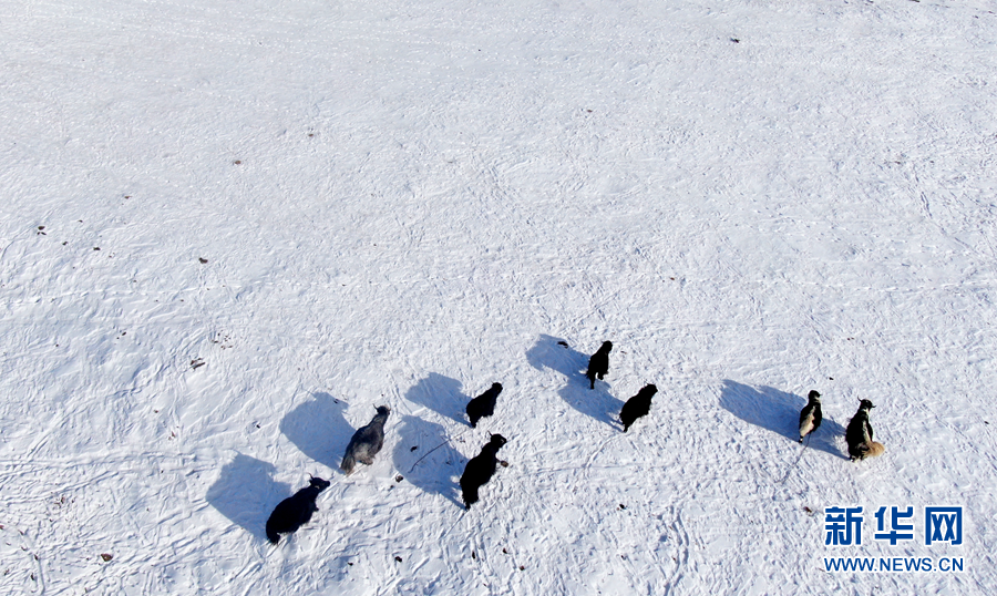 12月6日,羊群在雪后的阿柔草原上活動(無人機照片)。新華社記者 張宏祥 攝