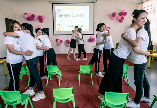 9月9日,江西省吉安市新干縣麥鎮(zhèn)中心幼兒園支教老師鄒小琳(左五)正在對(duì)該園幼教老師進(jìn)行禮儀培訓(xùn)。視覺中國供圖