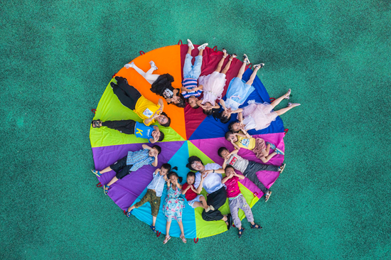 9月9日,江西省吉安市新干縣城上鄉(xiāng)中心幼兒園支教幼師敖敏慧(黃衣服)和劉智秀(白衣服)正在指導(dǎo)該園幼兒開展降落傘游戲。視覺中國供圖