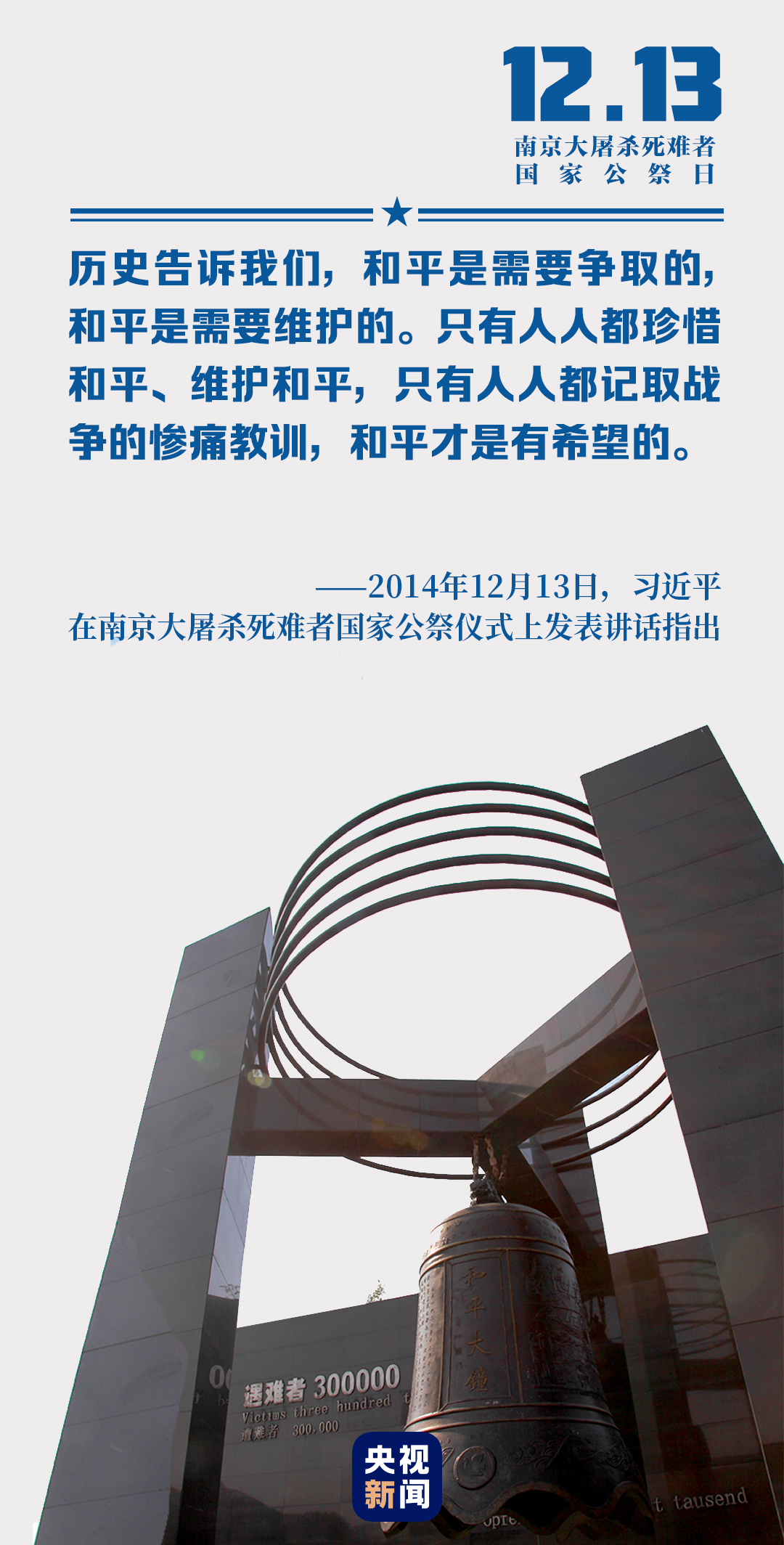 6年來,我們以國家之名祭奠死難者,以尊崇之心珍視和平,以民族之力矢志復(fù)興。