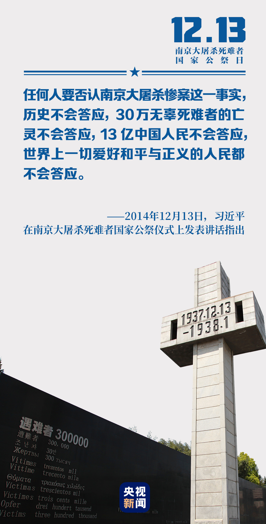 “昭昭前事,惕惕后人”,“永矢弗諼,祈愿和平”,“我們?yōu)槟暇┐笸罋⑺离y者舉行公祭儀式,是要喚起每一個(gè)善良的人們對(duì)和平的向往和堅(jiān)守,而不是要延續(xù)仇恨”,習(xí)近平話語(yǔ)鏗鏘。