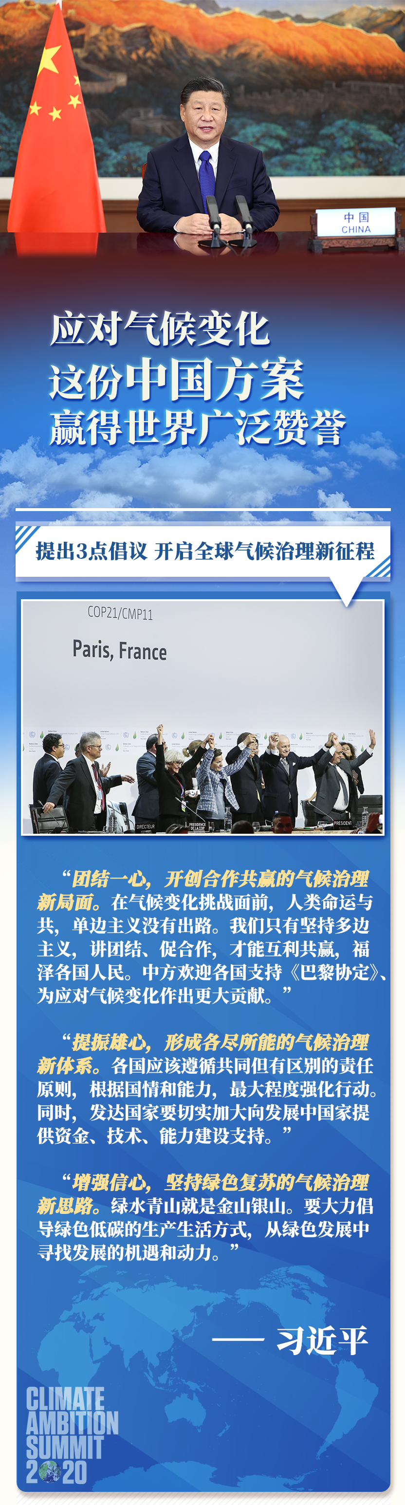 12月12日,習(xí)近平主席在氣候雄心峰會上通過視頻發(fā)表題為《繼往開來,開啟全球應(yīng)對氣候變化新征程》的重要講話,闡釋應(yīng)對氣候變化的中國主張,宣布中國國家自主貢獻最新舉措。