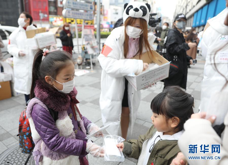 2月29日,在日本東京的池袋站前,在日華僑華人志愿者團體“口罩熊貓行動小組”向當?shù)孛癖娒赓M發(fā)放口罩,一名小志愿者(左)將兒童用口罩送給日本小朋友。新華社記者 杜瀟逸 攝