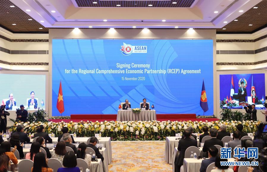 這是11月15日在越南首都河內拍攝的區(qū)域全面經(jīng)濟伙伴關系協(xié)定(RCEP)簽署儀式現(xiàn)場。新華社/越通社