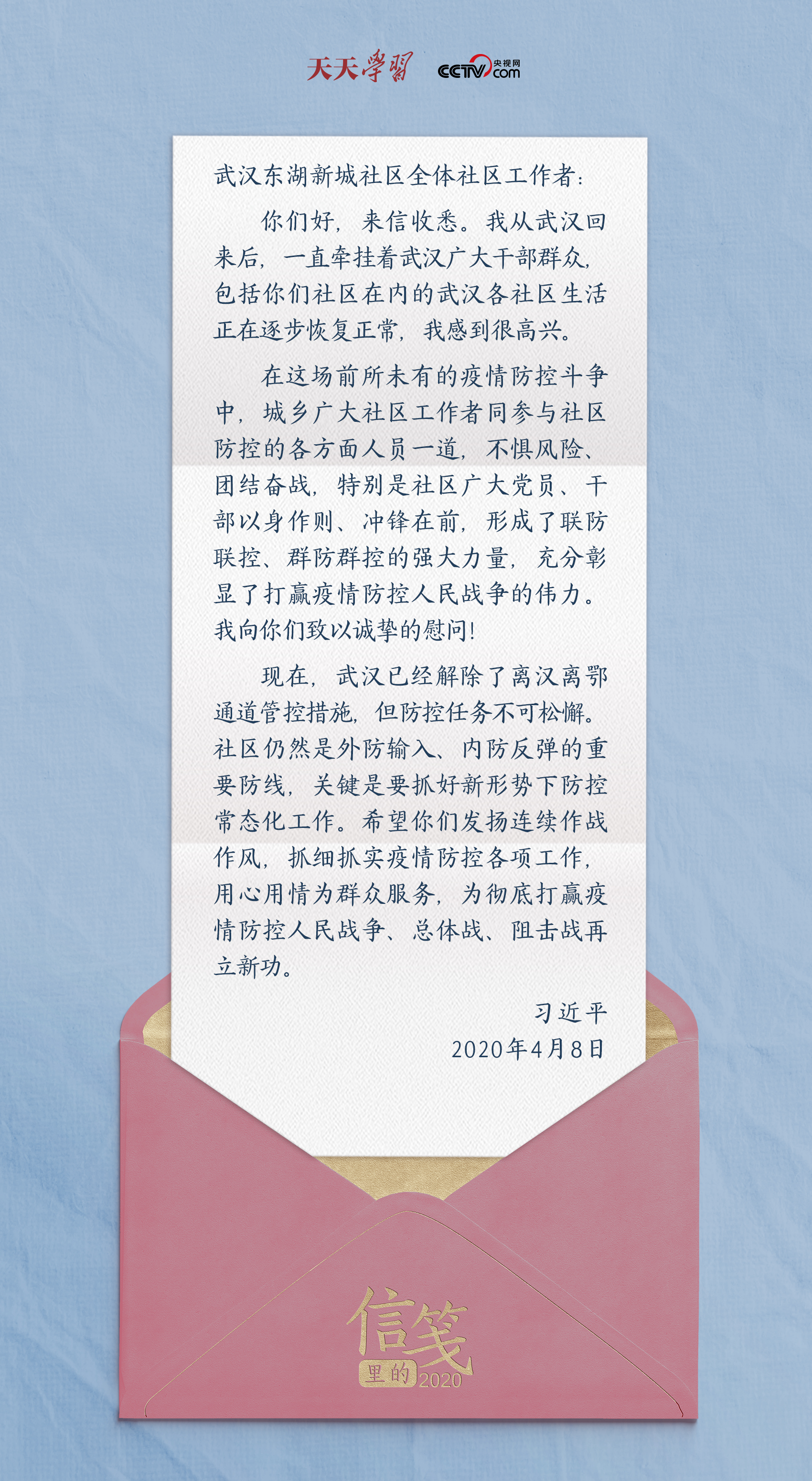 4月8日,武漢解封。在給武漢東湖新城社區(qū)全體社區(qū)工作者的回信中,總書記再次肯定城鄉(xiāng)廣大社區(qū)工作者在疫情防控斗爭中發(fā)揮的重要作用,并鼓勵他們“抓細(xì)抓實疫情防控各項工作,用心用情為群眾服務(wù)”,再立新功。