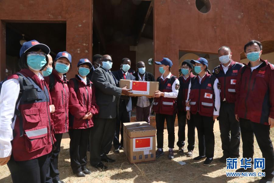 5月19日,在津巴布韋中馬紹納蘭省的姆武爾維醫(yī)院,中國抗疫醫(yī)療專家組為當?shù)蒯t(yī)療機構(gòu)捐贈醫(yī)療物資。新華社記者 張玉亮 攝