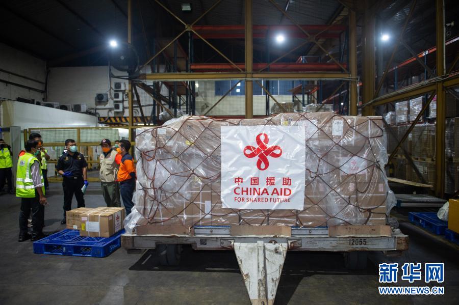 3月26日,中國援助印度尼西亞的首批抗疫物資停放在雅加達蘇加諾哈達機場倉庫。新華社記者 杜宇 攝
