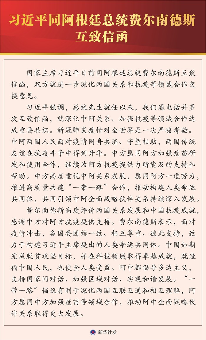 國家主席習(xí)近平日前同阿根廷總統(tǒng)費(fèi)爾南德斯互致信函,雙方就進(jìn)一步深化兩國關(guān)系和抗疫等領(lǐng)域合作交換意見。