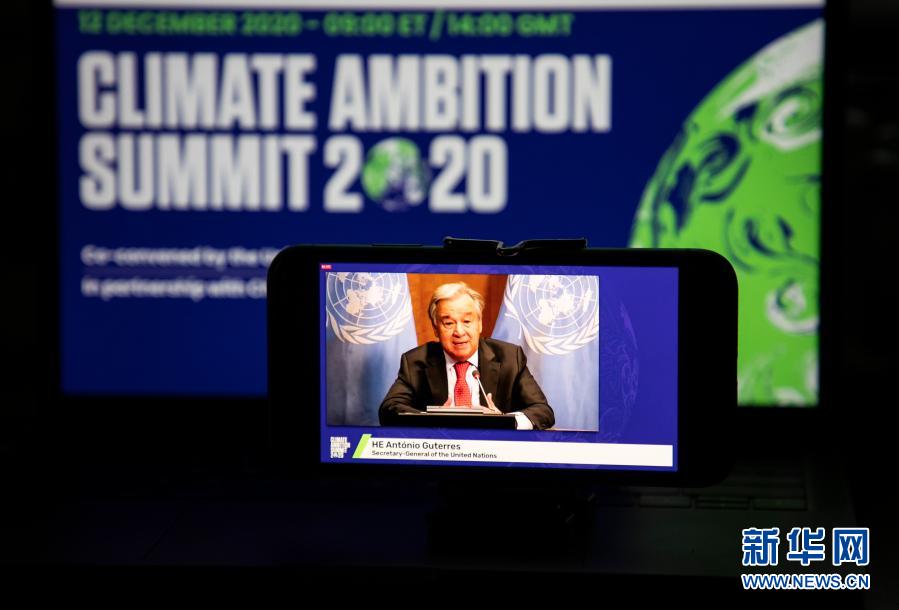 這是2020年12月12日在美國(guó)紐約拍攝的聯(lián)合國(guó)秘書(shū)長(zhǎng)古特雷斯在氣候雄心峰會(huì)上通過(guò)視頻發(fā)表講話的屏幕畫(huà)面。氣候雄心峰會(huì)由聯(lián)合國(guó)及有關(guān)國(guó)家倡議舉辦,旨在紀(jì)念《巴黎協(xié)定》達(dá)成五周年,進(jìn)一步動(dòng)員國(guó)際社會(huì)強(qiáng)化氣候行動(dòng),推進(jìn)多邊進(jìn)程。新華社記者 王迎 攝