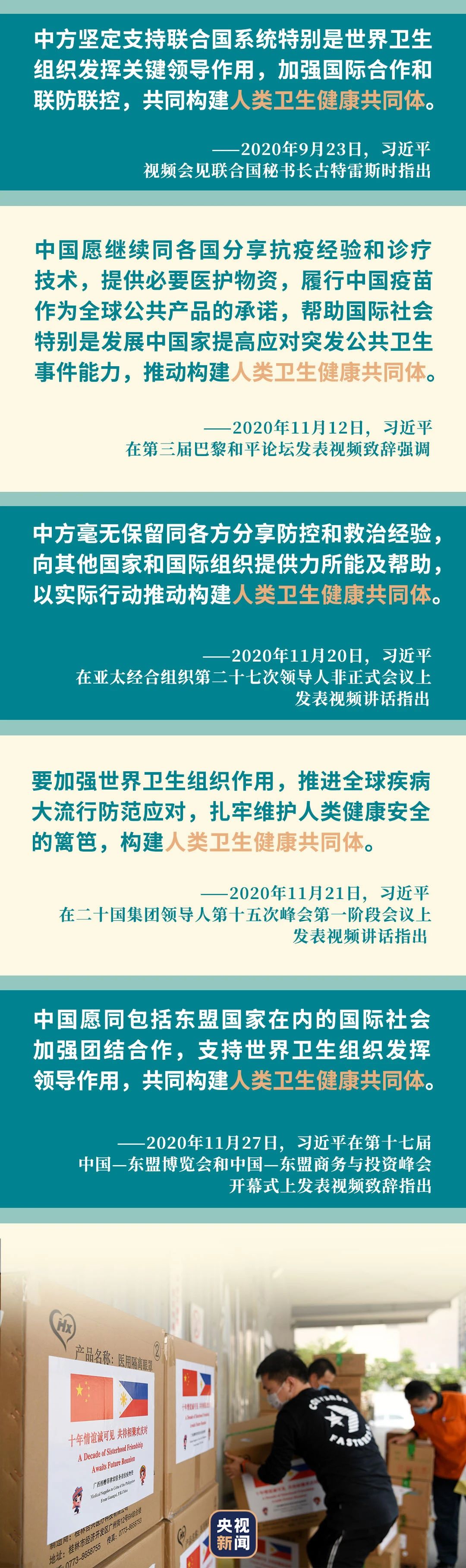 疫情發(fā)生以來,中國積極履行國際義務,密切同世界衛(wèi)生組織和相關國家的友好合作,主動同國際社會分享疫情和病毒信息、抗疫經(jīng)驗做法。向150多個國家和10個國際組織提供抗疫援助,向34個國家派出36支醫(yī)療專家組,向各國提供2200多億只口罩、22.5億件防護服、10.2億份檢測試劑盒,加入“新冠肺炎疫苗實施計劃”,承諾將疫苗作為全球公共產品……中國履行國際義務,發(fā)揮全球抗疫物資最大供應國作用,共同構建人類衛(wèi)生健康共同體。