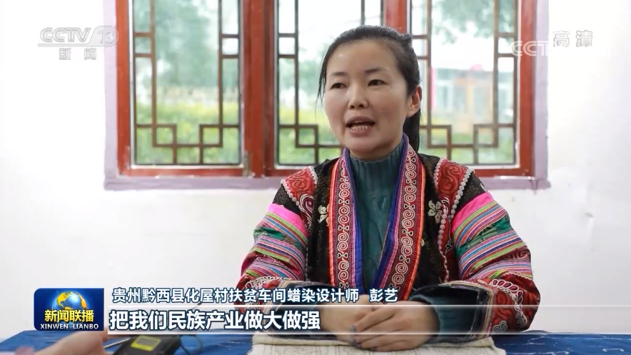 貴州黔西縣化屋村扶貧車間蠟染設(shè)計(jì)師 彭藝:把我們民族產(chǎn)業(yè)做大做強(qiáng),讓我們苗族同胞的生活,過(guò)得像我們蠟染刺繡一樣精彩。