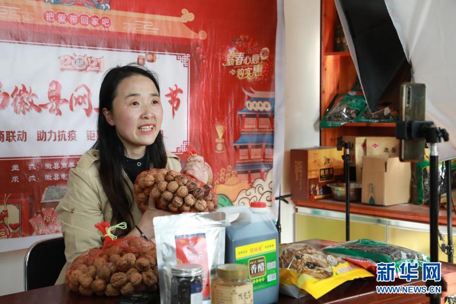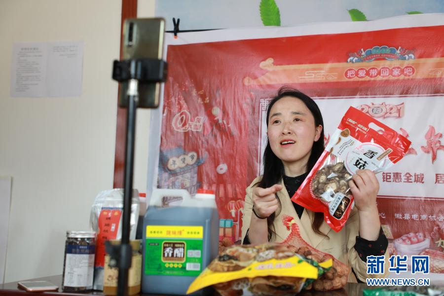 2月23日,在位于甘肅隴南市徽縣的店鋪中,全國人大代表梁倩娟在網(wǎng)上直播銷售當?shù)剞r特產(chǎn)品?!⌒氯A社記者 張智敏 攝