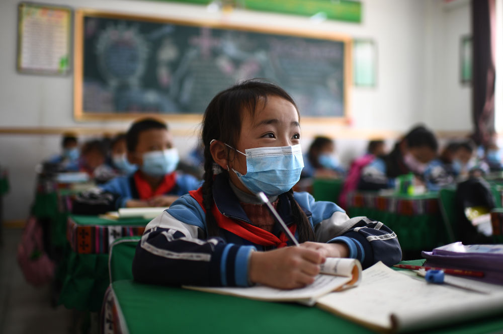 ↑ 玉樹市第三完全小學二年級一班學生求永藏嘎在上課(2020年4月9日攝)。