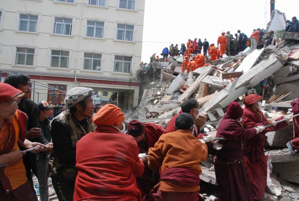 ↓ 圖為2010年4月16日,救援人員在結(jié)古寺賓館進行救援。