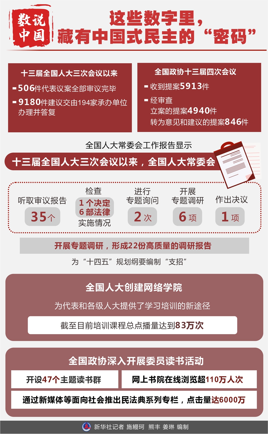 數(shù)字,蘊藏中國式民主的“密碼”。透過全國人大常委會工作報告、全國政協(xié)常委會工作報告和提案工作情況報告,讓我們從幾組關(guān)鍵數(shù)據(jù)進行“解碼”。