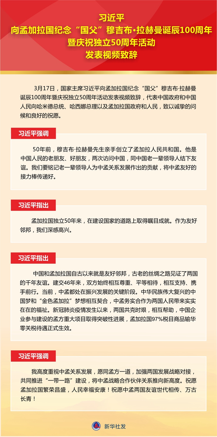 新華社北京3月17日電 3月17日,國家主席習近平向孟加拉國紀念“國父”穆吉布·拉赫曼誕辰100周年暨慶祝獨立50周年活動發(fā)表視頻致辭,代表中國政府和中國人民向哈米德總統(tǒng)、哈西娜總理以及孟加拉國政府和人民,致以誠摯的問候和良好的祝愿。