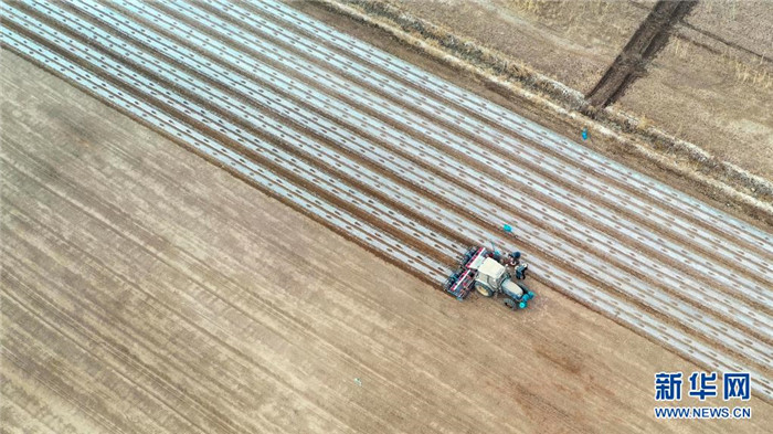 在新疆尉犁縣塔里木鄉(xiāng)英努爾村,農(nóng)民駕駛大馬力拖拉機(jī)在棉田里進(jìn)行鋪膜作業(yè)(3月28日攝)。新華社發(fā)(汪志鵬 攝)