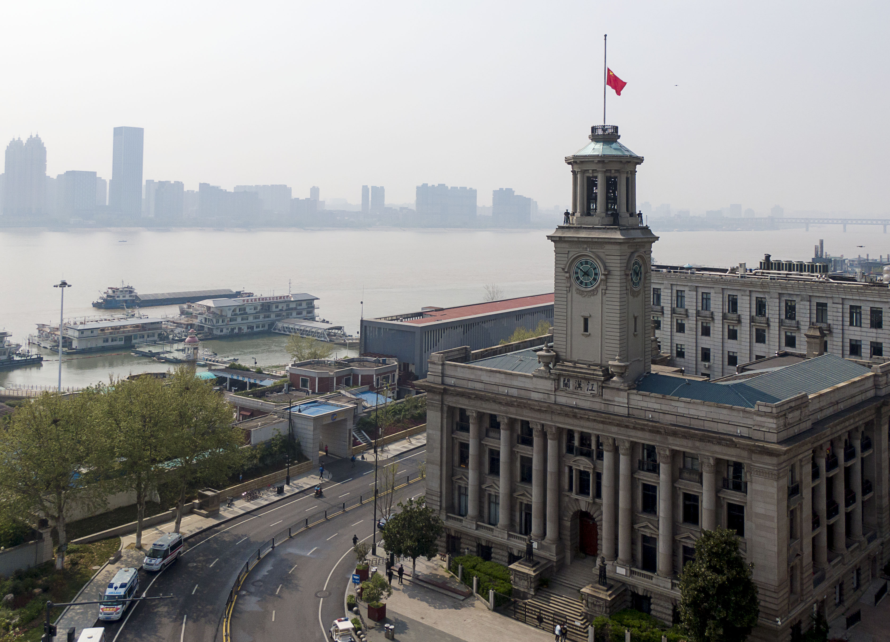 ↑2020年4月4日,武漢市舉行哀悼活動,表達對抗擊新冠肺炎疫情斗爭犧牲烈士和逝世同胞的深切哀悼。這是武漢江漢關(guān)大樓下半旗志哀。新華社記者 熊琦 攝
