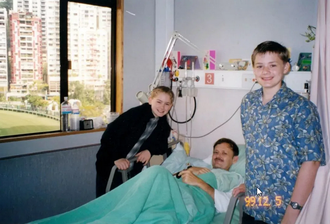 1999年潘維廉在香港一家醫(yī)院接受癌癥手術,和家人在一起。(圖源:人民日報客戶端)