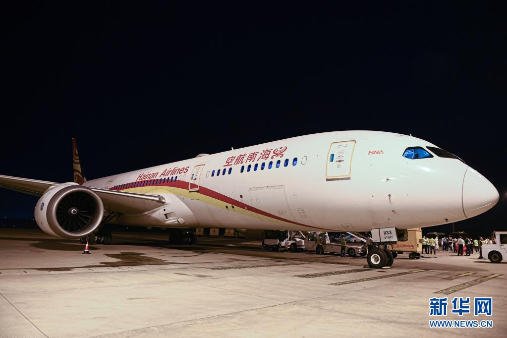 這是3月26日在??诿捞m國際機場拍攝的海南航空HU787航班。3月27日凌晨,該航班搭載貨物從海口飛往法國巴黎,海南自貿(mào)港首條定期洲際貨運航線正式開通。新華社記者 蒲曉旭 攝