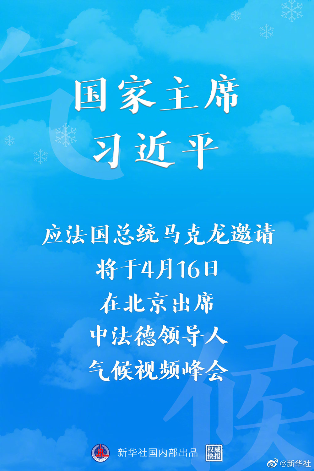 外交部發(fā)言人華春瑩15日宣布:應(yīng)法國總統(tǒng)馬克龍邀請,國家主席習(xí)近平將于4月16日在北京出席中法德領(lǐng)導(dǎo)人氣候視頻峰會。 ​​​​