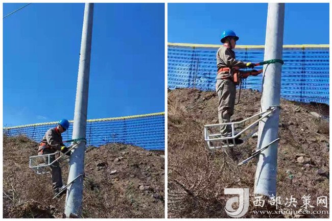 西部決策網(wǎng)訊 裝好防墜裝置,系好安全帶,苗壯踩著腳扣慢慢向電桿上方爬去。緊固接線端子、清理?xiàng)U頂異物。沒多久,他后背的衣服就被汗水浸透了,隨著氣溫不斷上升,苗壯在與地面同事溝通時,嗓音也逐漸沙啞起來。這樣的場景,對他來說已是家常便飯。