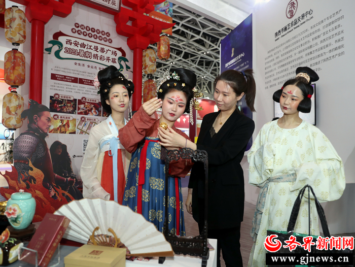 在第五屆絲博會(huì)陜文投集團(tuán)展區(qū),身著漢服的工作人員向觀眾介紹文創(chuàng)產(chǎn)品。 記者 杜靜波 攝