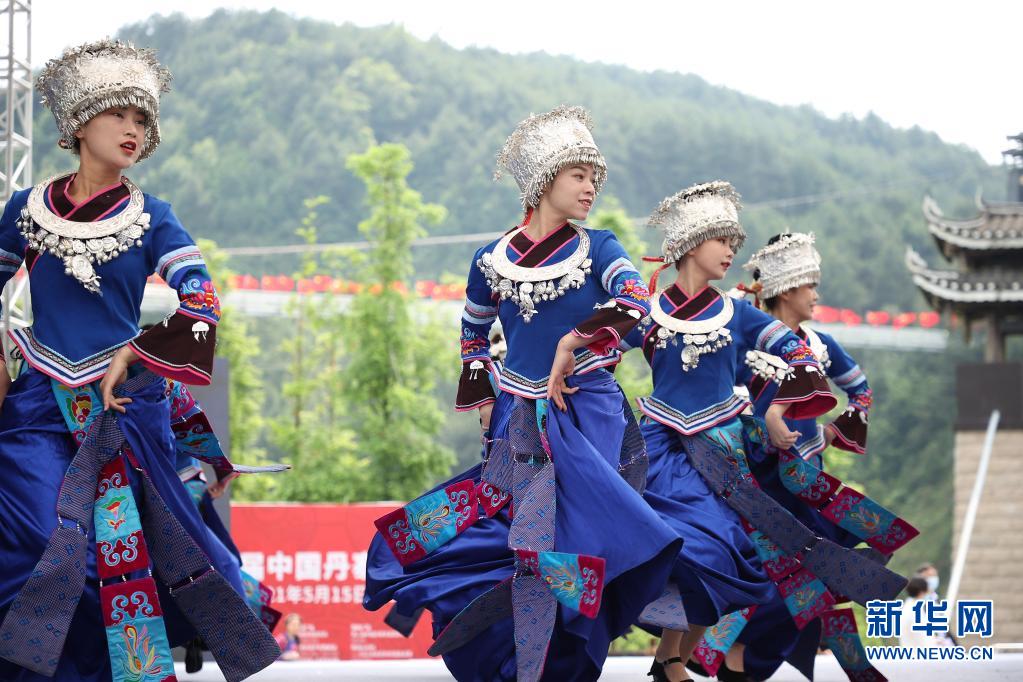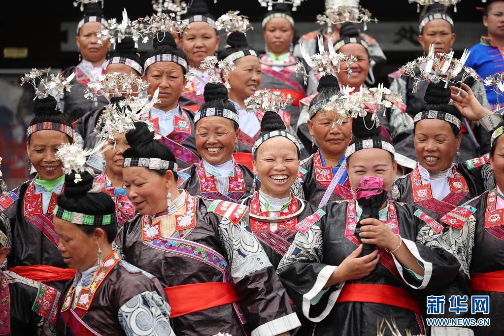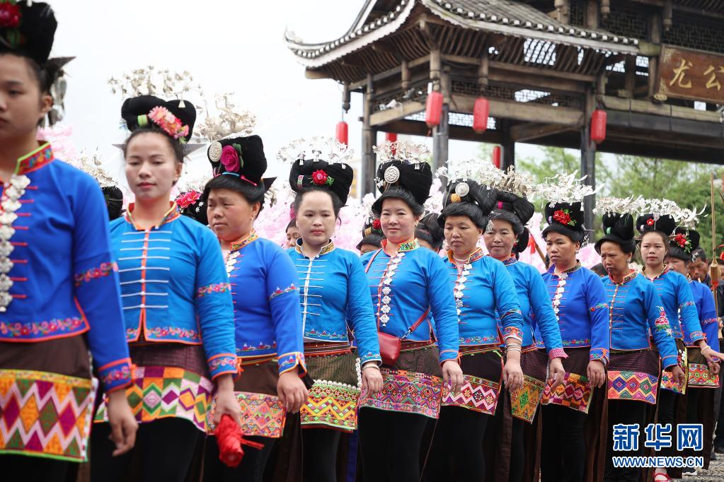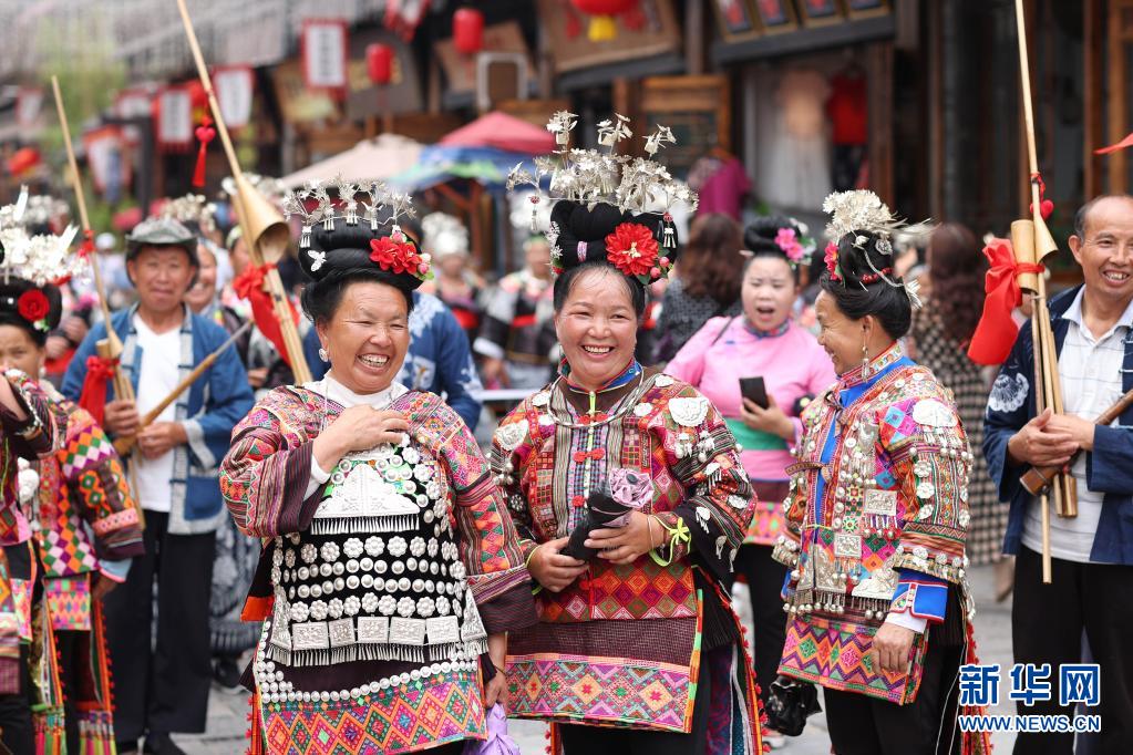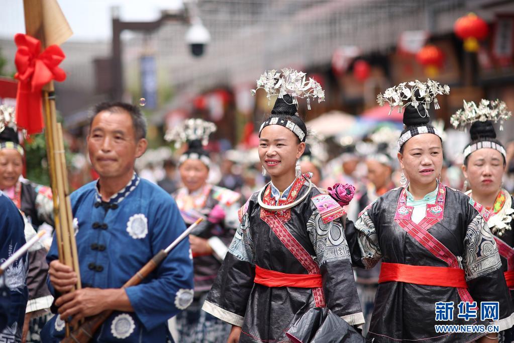 當(dāng)日,貴州省黔東南苗族侗族自治州丹寨縣萬達小鎮(zhèn)在“第二屆中國丹寨非遺周”中舉辦苗族盛裝巡游、非遺歌舞展演活動。