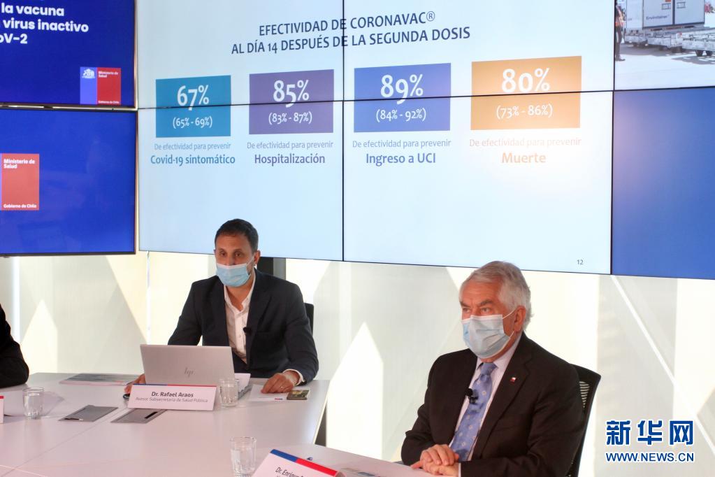 4月16日,智利衛(wèi)生部長帕里斯(右)與智利衛(wèi)生部顧問阿勞斯在圣地亞哥出席發(fā)布會,公布中國科興新冠疫苗保護效果在該國的真實世界研究結果。新華社發(fā)(智利衛(wèi)生部供圖)