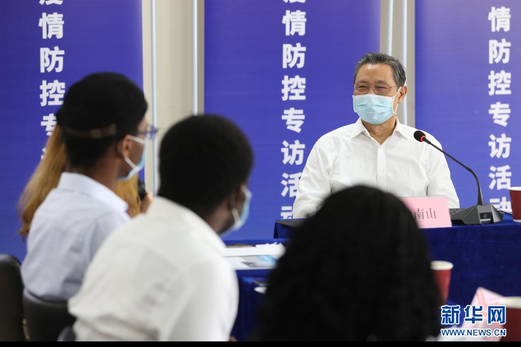 2020年4月15日,廣州市人民政府新聞辦公室在廣州醫(yī)科大學舉辦廣州市第78場疫情防控新聞采訪活動,鐘南山與在穗工作學習的外籍人士代表進行座談交流。新華社記者 李嘉樂 攝