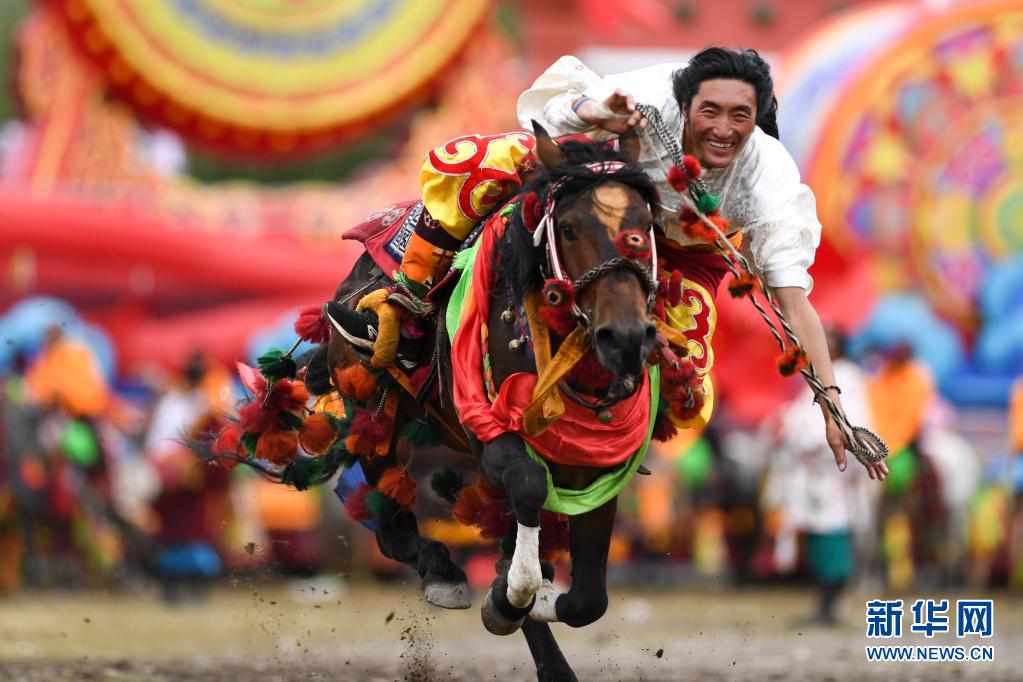 8月4日,當(dāng)?shù)厝罕娫谟駱洳刈遄灾沃莩闪?0周年慶祝大會上表演傳統(tǒng)賽馬。新華社記者 吳剛 攝