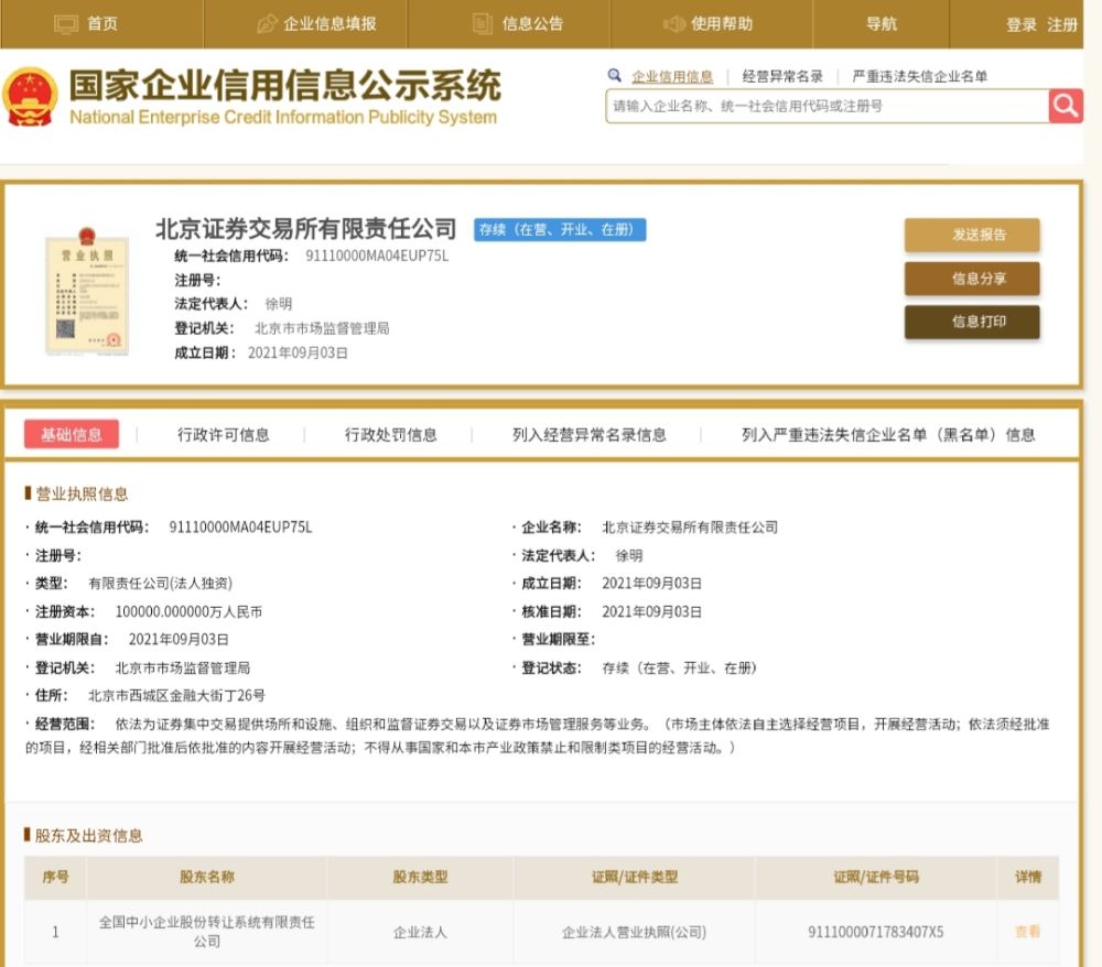 北京證券交易所有限責(zé)任公司注冊(cè)成立,將讓越來(lái)越多“專精特新”企業(yè)得到資本市場(chǎng)助力。圖片來(lái)源:國(guó)家企業(yè)信用信息公示系統(tǒng)官網(wǎng)