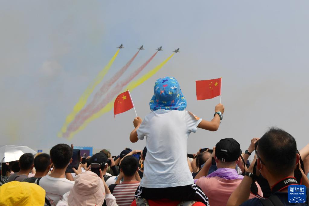 10月1日,在第十三屆中國國際航空航天博覽會(huì)上,中國空軍八一飛行表演隊(duì)飛行員舉國旗向觀眾致意。新華社記者 琚振華 攝