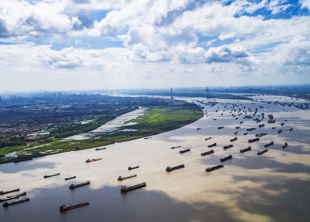這是2018年8月13日通過無人機(jī)拍攝的船舶在湖北省武漢市陽邏港區(qū)水域行駛。(新華社記者肖藝九攝)