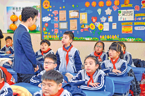 12月3日,在湖州市月河小學(xué)教育集團(tuán)湖東校區(qū),湖東街道邀請律師志愿者講解憲法知識,與學(xué)生互動。在國家憲法日來臨之際,浙江省湖州市吳興區(qū)組織開展憲法主題教育宣傳活動,走進(jìn)社區(qū)、學(xué)校宣講憲法知識。新華社記者黃宗治攝