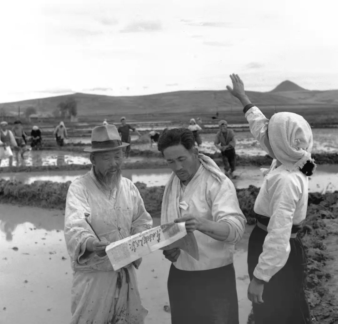 1954年6月26日,“中華人民共和國憲法草案”公布的消息傳到了吉林省延邊朝鮮族自治區(qū),正在田間勞動的崔竹松農(nóng)業(yè)生產(chǎn)合作社社員們爭相趕來閱讀公布憲法草案的好消息。新華社發(fā)
