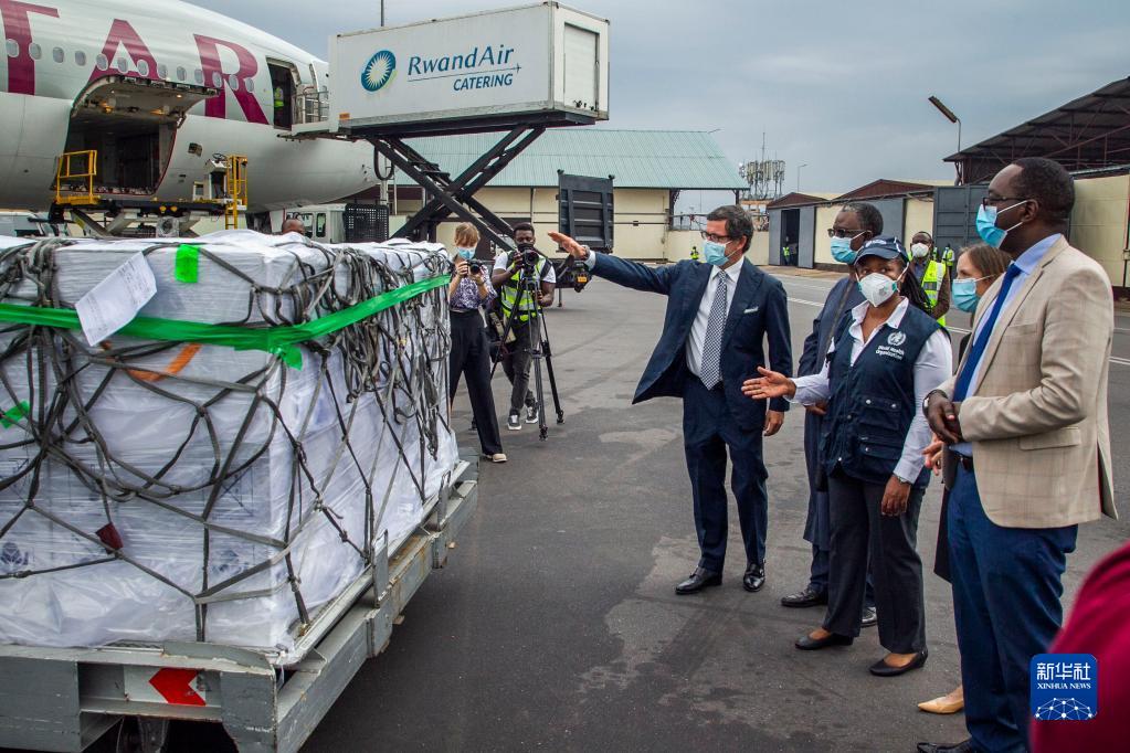 盧旺達(dá)衛(wèi)生部長達(dá)尼埃爾·恩加米杰(右一)等官員在基加利國際機(jī)場查看該國首批通過COVAX計劃收到的新冠疫苗(2021年3月3日)。新華社發(fā)(西里爾·恩德格亞攝)