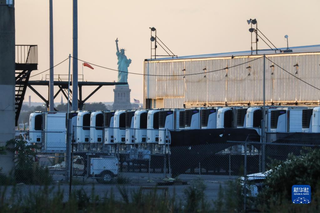 這是在美國紐約布魯克林拍攝的一處臨時停尸場內(nèi)存放新冠患者遺體的冷藏車(2021年9月6日攝)。新華社記者 王迎 攝