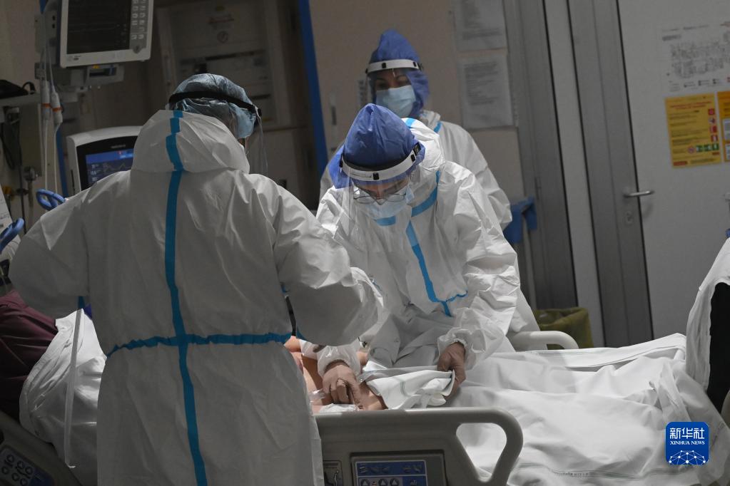 醫(yī)務(wù)人員在意大利博洛尼亞一家醫(yī)院的新冠隔離區(qū)對患者進(jìn)行治療(2021年12月3日)。新華社發(fā)(賈尼·斯基基攝)