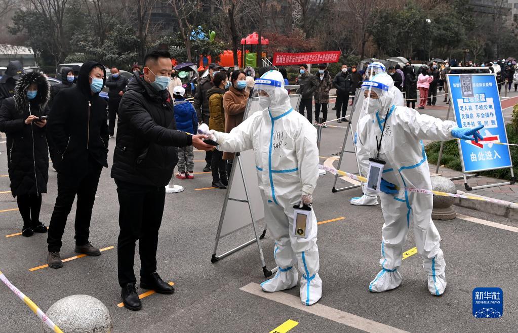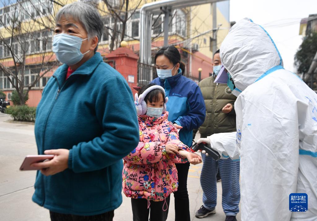 12月23日,西安市蓮湖區(qū)一處社區(qū),工作人員為接受核酸檢測(cè)的居民測(cè)溫。新華社記者 張博文 攝