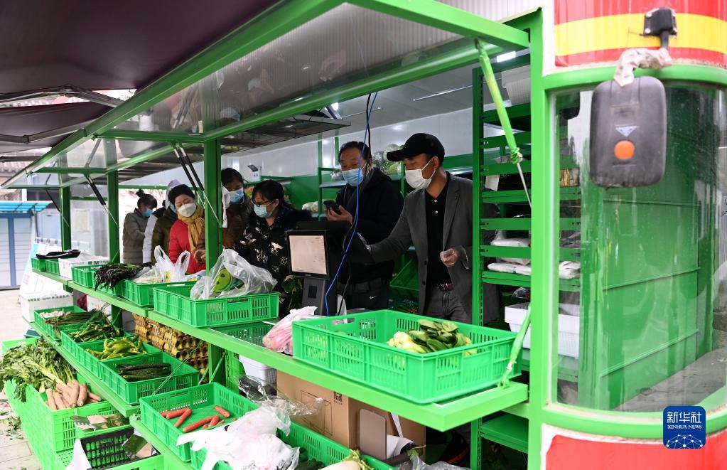 12月23日,西安市曲江新區(qū)一小區(qū)引入蔬菜大棚車,住戶在小區(qū)內(nèi)買菜。新華社記者 劉瀟 攝