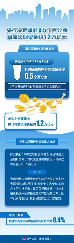 中國人民銀行12月6日宣布,決定于2021年12月15日下調(diào)金融機(jī)構(gòu)存款準(zhǔn)備金率0.5個百分點(不含已執(zhí)行5%存款準(zhǔn)備金率的金融機(jī)構(gòu))。此次為全面降準(zhǔn),共計釋放長期資金約1.2萬億元。新華社發(fā) 宋博 制圖