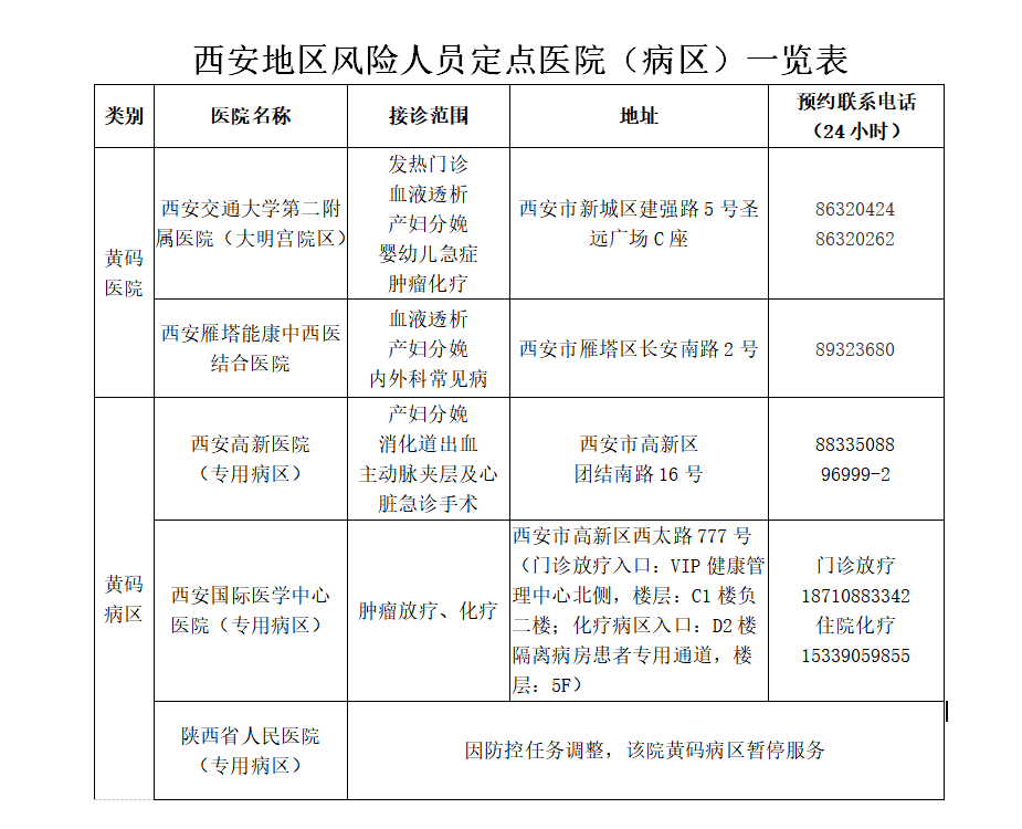 目前,經(jīng)省市協(xié)調(diào),西安地區(qū)已設(shè)立“黃碼醫(yī)院”2家“黃碼病區(qū)”2個(名單見下表),后續(xù)開設(shè)的“黃碼醫(yī)院”“黃碼病區(qū)”等風險人員定點醫(yī)院(病區(qū))由地市自行發(fā)布。
