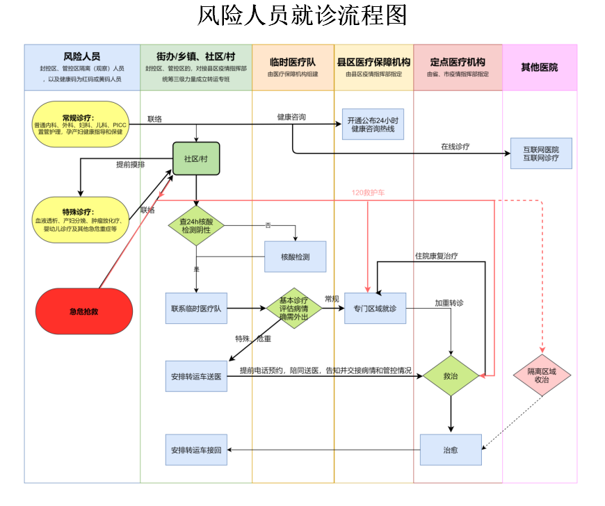 有急診搶救醫(yī)療需求的風險人員,直接撥打120急救電話,同時通知社區(qū)(村)工作人員對接120救護車、填寫人員交接單,由120救護車聯(lián)系風險人員醫(yī)療保障醫(yī)療機構(gòu)、定點醫(yī)療機構(gòu),或就近送至具備相應(yīng)診療能力的醫(yī)療機構(gòu)。診療結(jié)束后,醫(yī)療機構(gòu)聯(lián)系社區(qū)(村)由縣區(qū)轉(zhuǎn)運專班“點對點”接回。