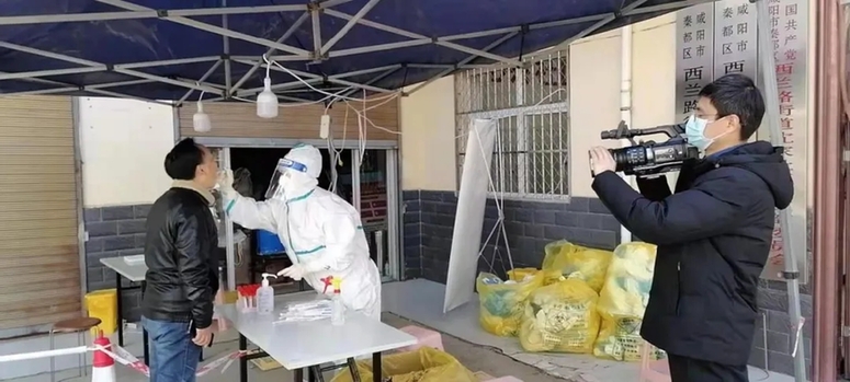 2021年12月21日,咸陽廣播電視臺記者李寒廣(右)、張潔在核酸檢測現(xiàn)場采訪。