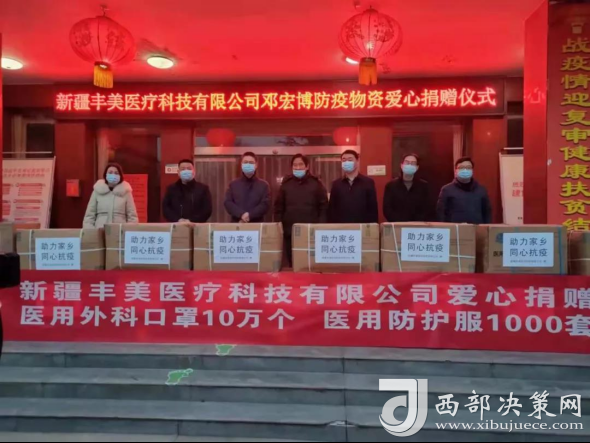 西部決策網(wǎng)訊 1月7日,在陜西省扶風(fēng)縣委政法委的組織協(xié)調(diào)下,新疆豐美醫(yī)療科技有限公司防疫物資捐贈儀式在扶風(fēng)縣衛(wèi)健局辦公樓前舉行。扶風(fēng)縣委副書記張湛林,縣委常委、政法委書記張萬鋒出席捐贈儀式。