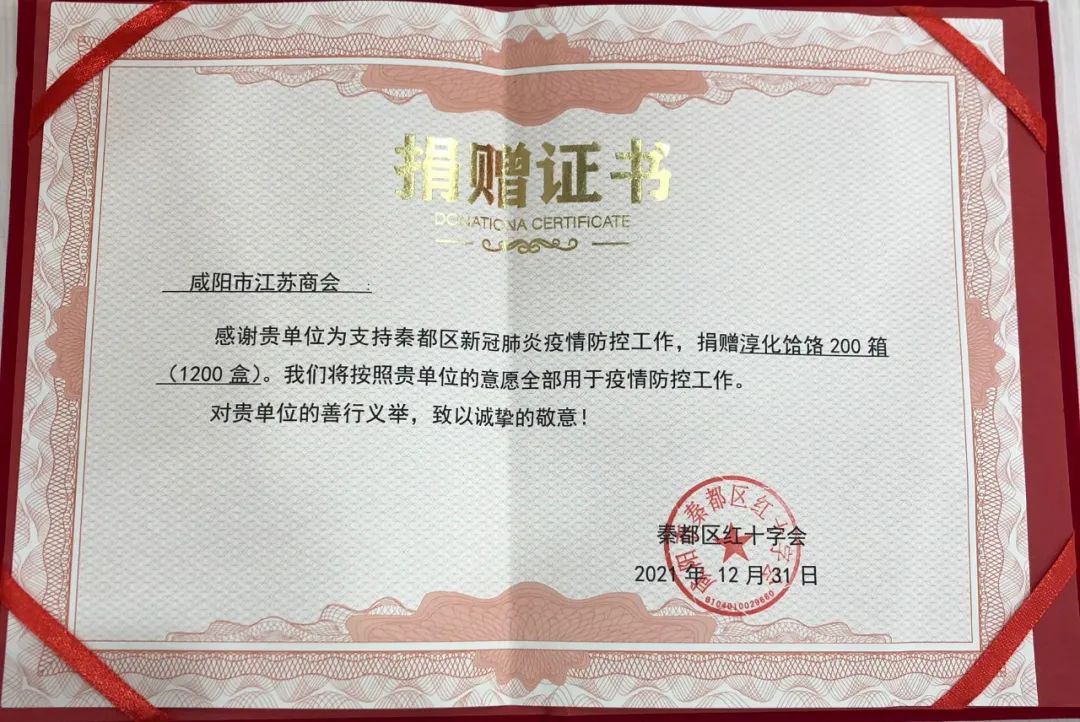 面對(duì)新一輪疫情,咸陽(yáng)市江蘇商會(huì)及會(huì)員企業(yè)以不同的方式表達(dá)對(duì)咸陽(yáng)市一線工作人員的關(guān)懷、對(duì)咸陽(yáng)戰(zhàn)“疫”的支持,展現(xiàn)了一幕幕一心共同抗疫情的感人畫(huà)面,充分展現(xiàn)了咸陽(yáng)市江蘇商會(huì)助力抗擊疫情的決心和信心,秦都區(qū)紅十字會(huì)向咸陽(yáng)市江蘇商會(huì)頒發(fā)捐贈(zèng)證書(shū)。