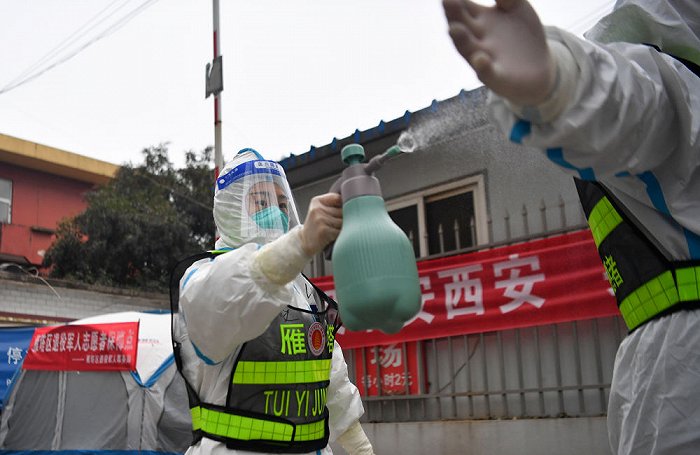 ↑1月7日,西安市雁塔區(qū)退役軍人志愿突擊隊隊員位娜娜協(xié)助隊友為防護服消毒。