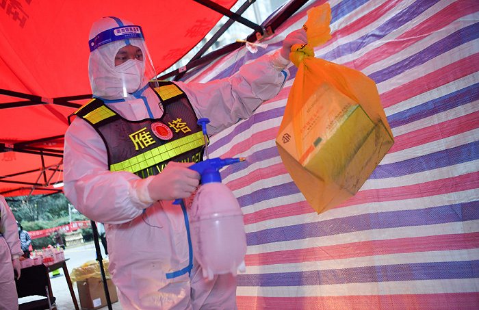 ↑1月7日,西安市雁塔區(qū)退役軍人志愿突擊隊隊員桑海鑫為核酸檢測樣本外包裝消毒。