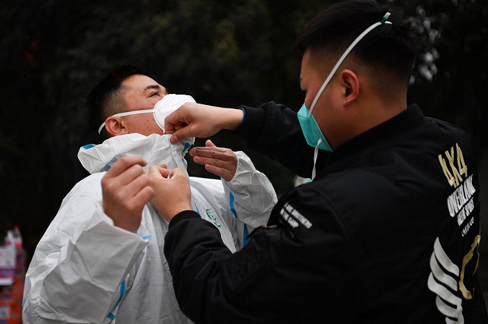 ↑1月7日,西安市雁塔區(qū)退役軍人志愿突擊隊隊員李龍(右)協(xié)助隊員吉存勝穿上防護服。